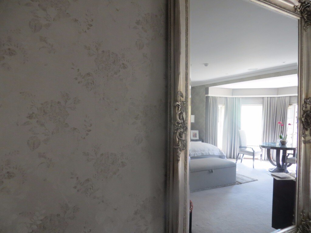 A stunning paper and muted tones make this a very special bedroom.